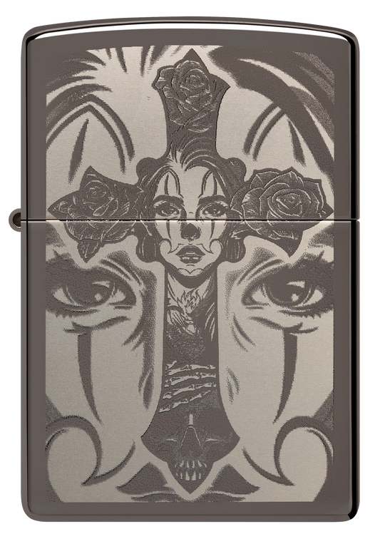 Zippo Spiritual Cross Girl Tattoo, Black Ice Lighter #48411