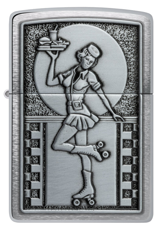 Zippo Rollerskate Waitress Emblem, Brushed Chrome Lighter #48904