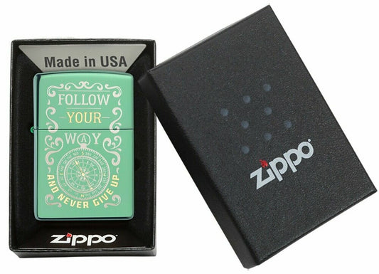 Zippo Follow Your Way Never Give Up Compass, High Polish Green Lighter #49161